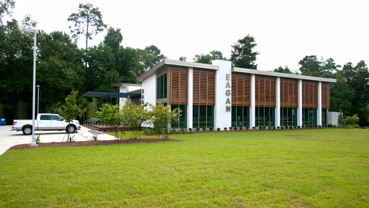 Comprised of private and open office spaces, the building takes advantage of a generous site by stretching to both ends of the property. The oversized windows provide an abundance of natural light to almost every space in the building, minimizing the need for artificial lighting while increasing employee productivity. The extended roof overhang provides shading from direct sunlight and deters rain from reaching the face of the building. The entry lobby’s double height brick tower fosters a sense of arrival and ensures that the building is seen from the nearby interstate.