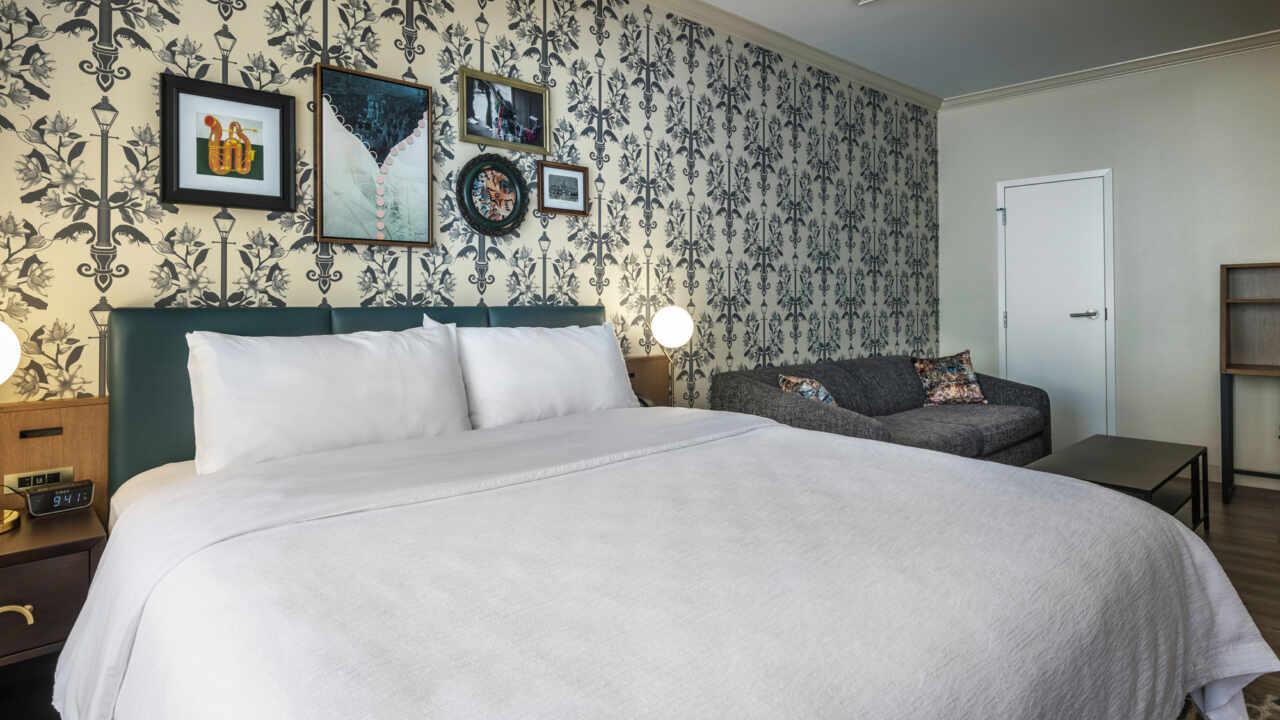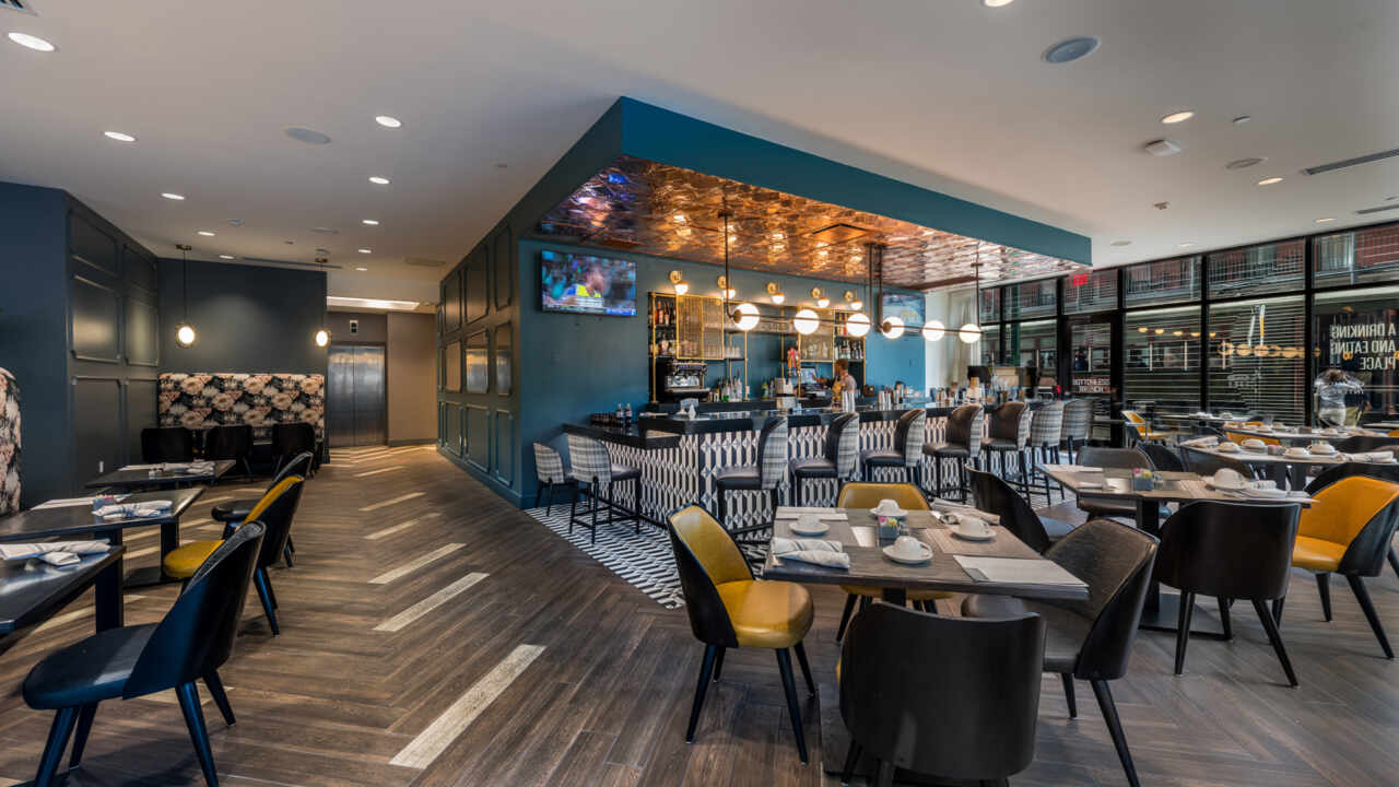 The quality of craftsmanship blends traditional southern design elements with a contemporary model of French Quarter hospitality. Brass finishes throughout the hotel mimic the instruments of the musicians for which the city is known. Many other finishes were custom fabricated to achieve a similar outcome. Haut blue paint in the guest bathrooms are reminiscent of traditional southern porch ceilings mixed with modern hexagonal porcelain tiles. At the guest room levels, streetcar track-inspired carpet "transports" guests to their rooms.