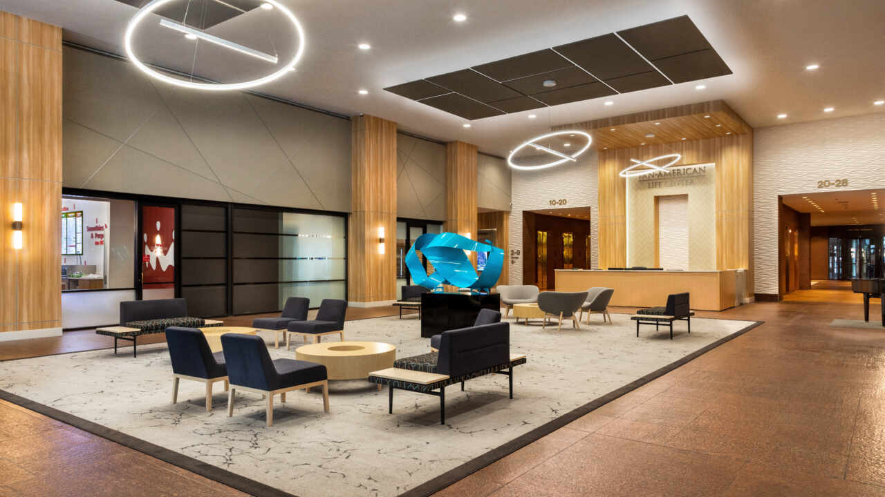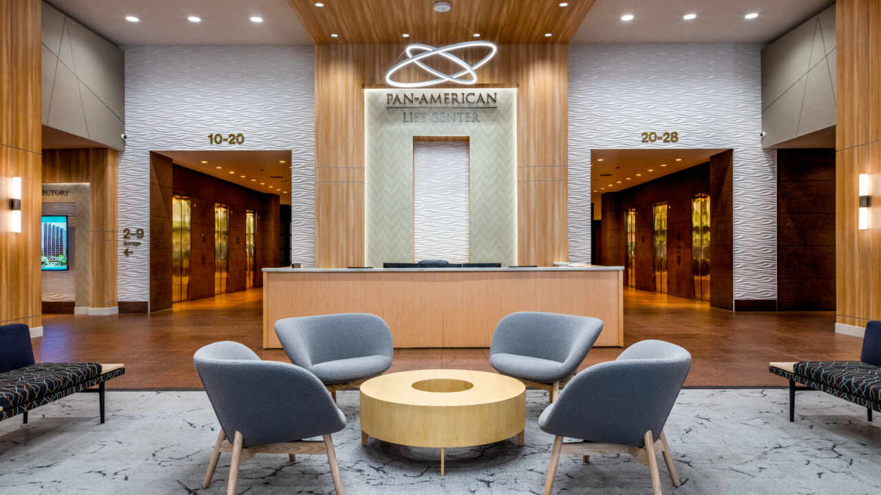 The Pan American Life Center, located on Poydras Street in downtown New Orleans, is one of the premier office buildings in New Orleans. DonahueFavret was tasked with the renovation of both the lobby and the 11th Floor. The lobby received fresh finishes and new fixtures to lighten up the main entrance corridor to this iconic building. The renovation of which was performed in an active space as business men and women still needed to access their office spaces on floors above. The 11th floor renovation included demolishing the existing 11th Floor down to the existing structure and starting with a clean slate. From a new kitchen and dining area to conference rooms, meeting rooms and an auditorium, the roughly 25,000 square foot space offers many amenities to the business culture in the city of New Orleans.