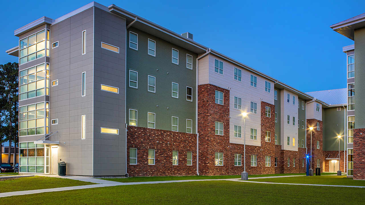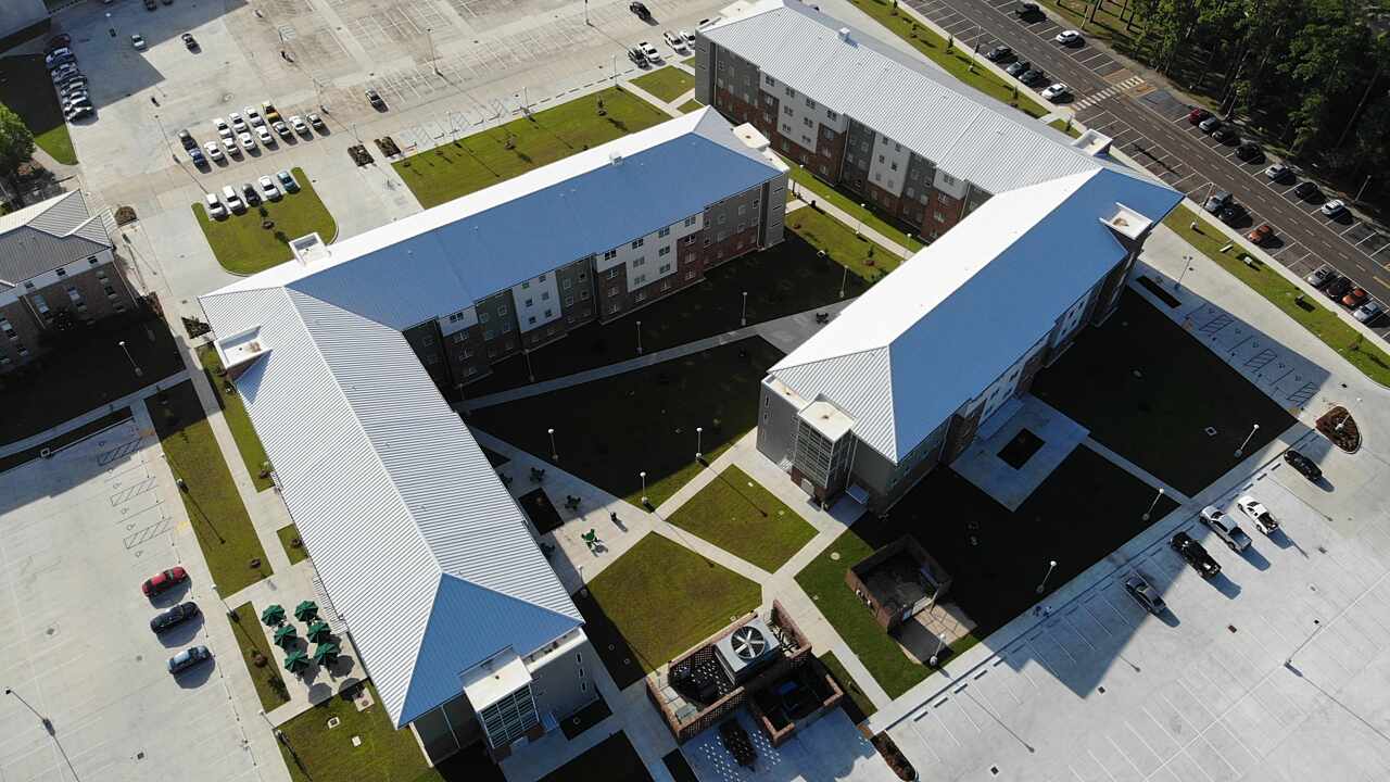 This 170,000 square foot project for Southeastern Louisiana University consisted of two buildings containing a total of 283 units (558 beds). The buildings were on a pile-supported foundation and were clad with Hardie siding and curtainwall glazing. This facility featured many high-end qualities such as LVT flooring and study halls as well as communal gathering areas. The building also uses a geothermal system for the heating and cooling of the building. A network of 222 wells were drilled and connected together to provide the necessary thermal properties to make the system as energy efficient as possible.